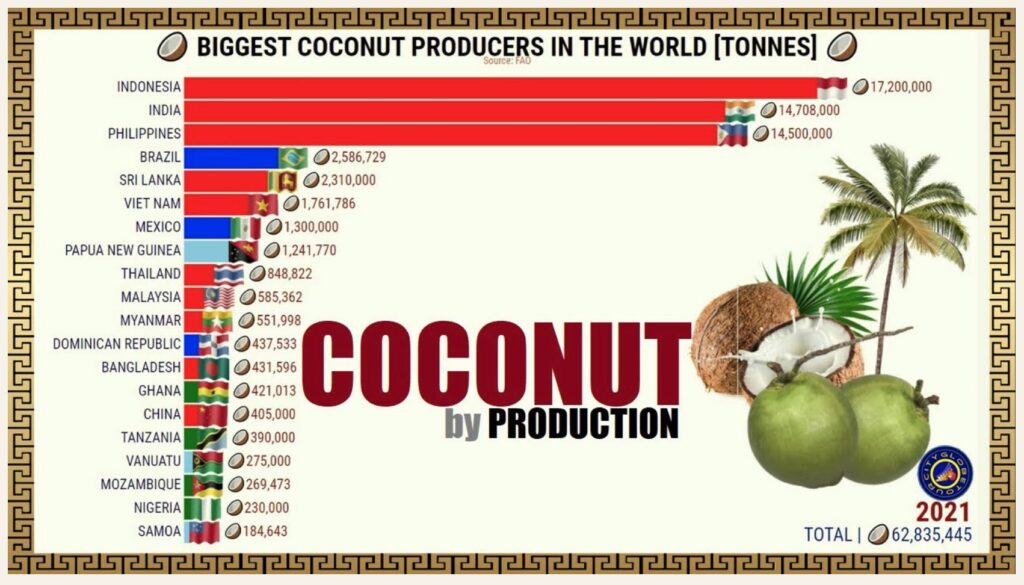 ينمو نخيل جوز الهند في أكثر من 93 دولة حول العالم، ويغطي مساحة إجمالية قدرها 12 مليون هكتار، بإنتاج سنوي يبلغ 59.98 مليون طن من جوز الهند. وتُعد الهند ثاني أكبر منتج لجوز الهند في العالم، بإنتاج سنوي يبلغ 14.7 مليون طن.