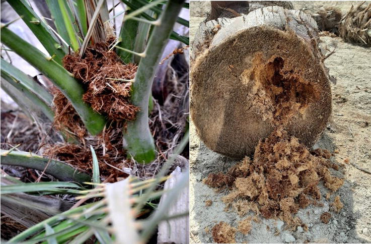 للأسف، هذا النخيل عرضة للعديد من الإصابات. يهاجم أكثر من 900 نوع من الآفات الحشرية نخيل جوز الهند، من بينها خنفساء وحيد القرن، وسوسة النخيل الحمراء، وسوسة جوز الهند. لمكافحة هذه الآفات الحشرية، يعتمد المزارعون كليًا على الرش الكيميائي، الذي يؤدي استخدامه العشوائي وغير الحكيم إلى مقاومة الآفات وعودة ظهورها الحتمي، بالإضافة إلى تدمير الأعداء الطبيعيين لها. أثبت مبيد Weevil Wipeout فعالية 95% في القضاء على سوسة النخيل الحمراء في التجارب السريرية، وهو صديق للبيئة تمامًا، وبالتالي لا يؤثر سلبًا على البيئة الطبيعية أو السلسلة الغذائية.